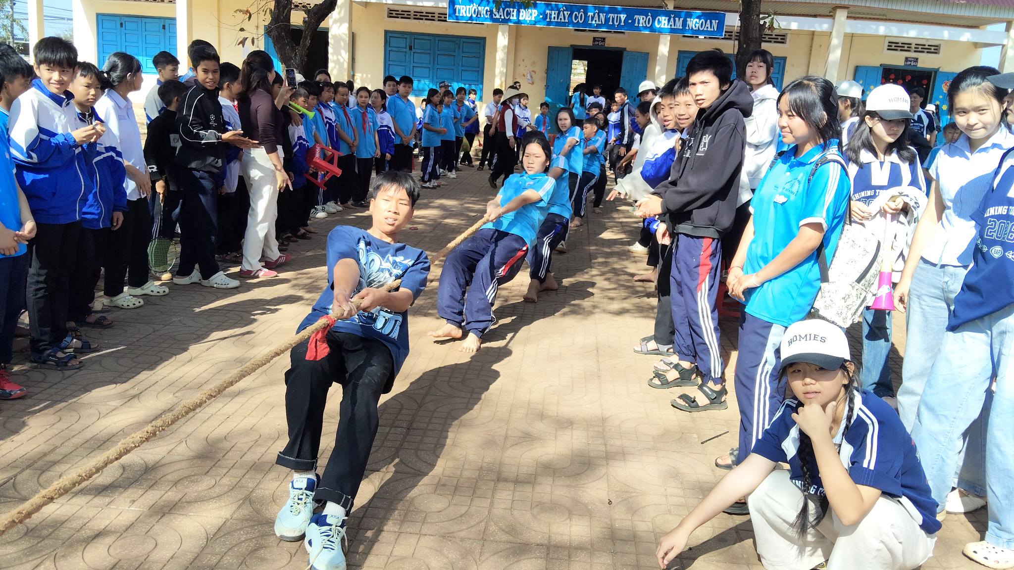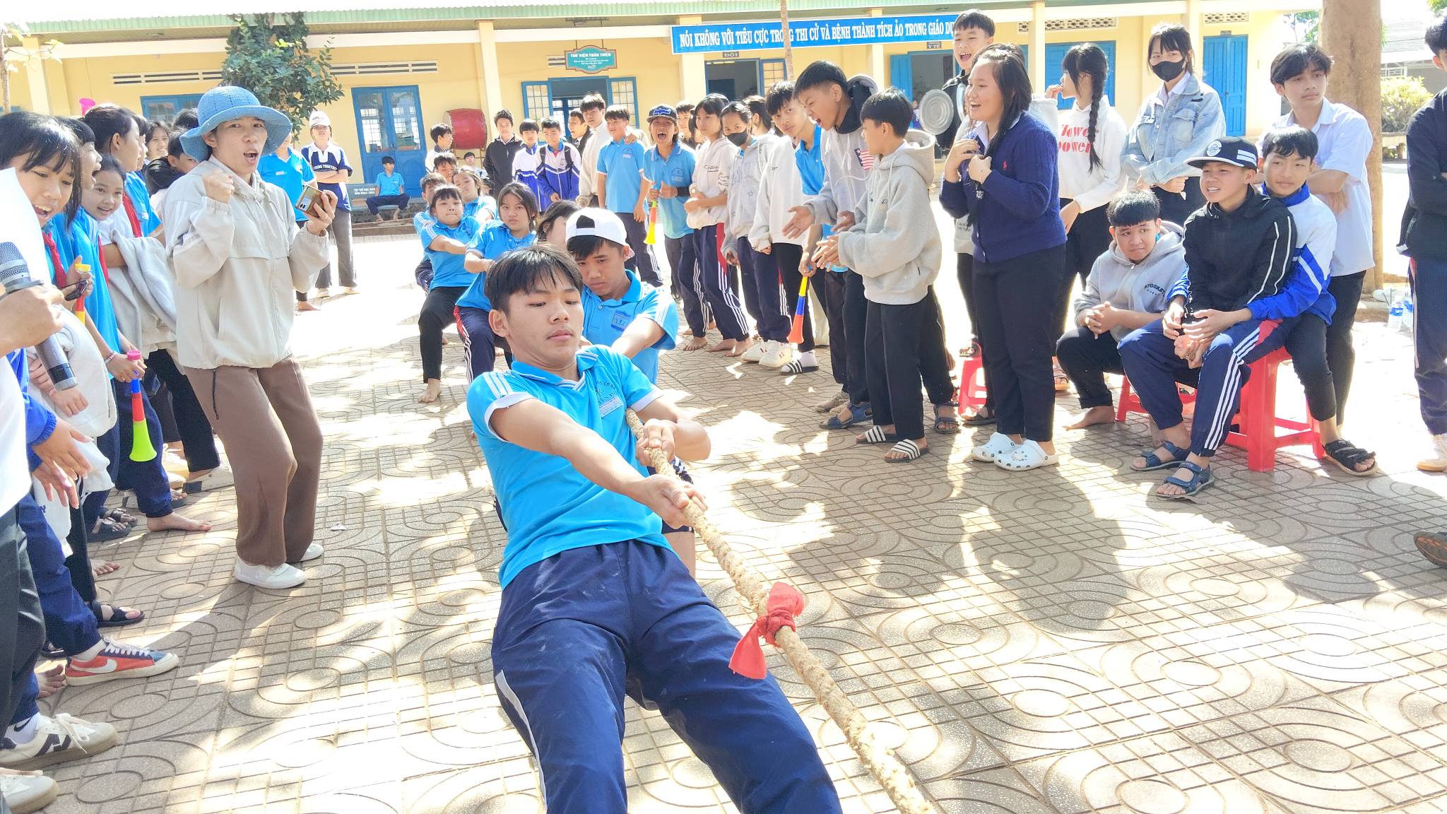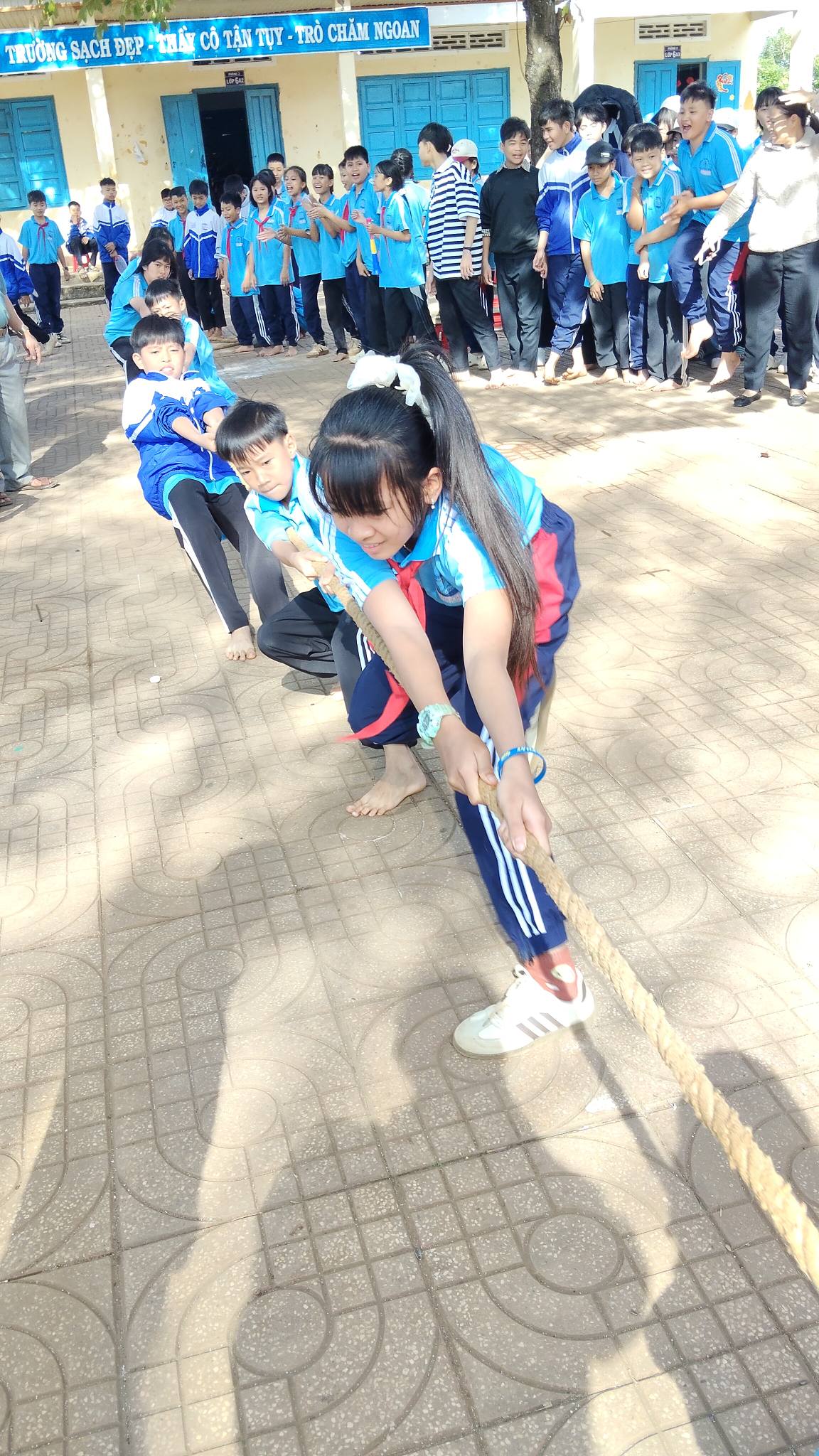Nổi bật là môn kéo co, nơi các đội thi đấu với tinh thần quyết tâm cao, thể hiện sức mạnh tập thể, sự phối hợp nhịp nhàng và ý chí bền bỉ. Tiếng hò reo cổ vũ vang khắp sân trường, tạo nên bầu không khí vô cùng hào hứng.